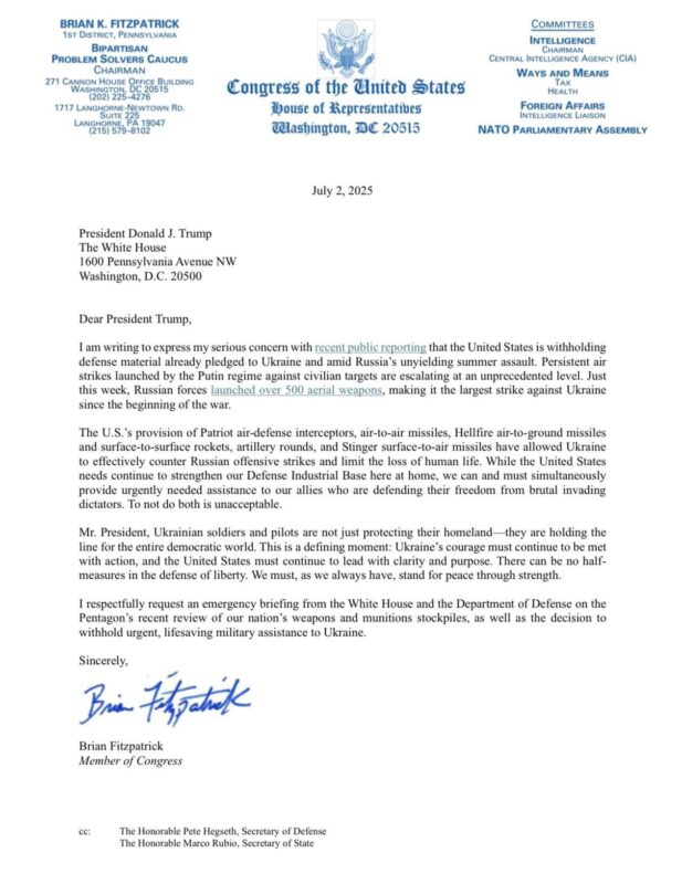 One of the first to respond publicly to the news about the pause in arms deliveries was Republican Congressman Brian Fitzpatrick. He officially appealed to President Donald Trump, demanding an urgent briefing. In his letter, Fitzpatrick emphasized: such news cannot remain unexplained especially against the backdrop of Ukrainian troops holding “the frontline of freedom” while Russian missiles and drones attack civilian infrastructure. The congressman called on the White House and Pentagon to transparently explain the reasoning behind this decision and disclose the real state of U.S. weapons reserves. His main demand was to guarantee that America is not turning away from Ukraine but remains a reliable partner in defense and security. In his view, supporting Ukraine is not just about diplomacy, but about defending core values and peace through strength.